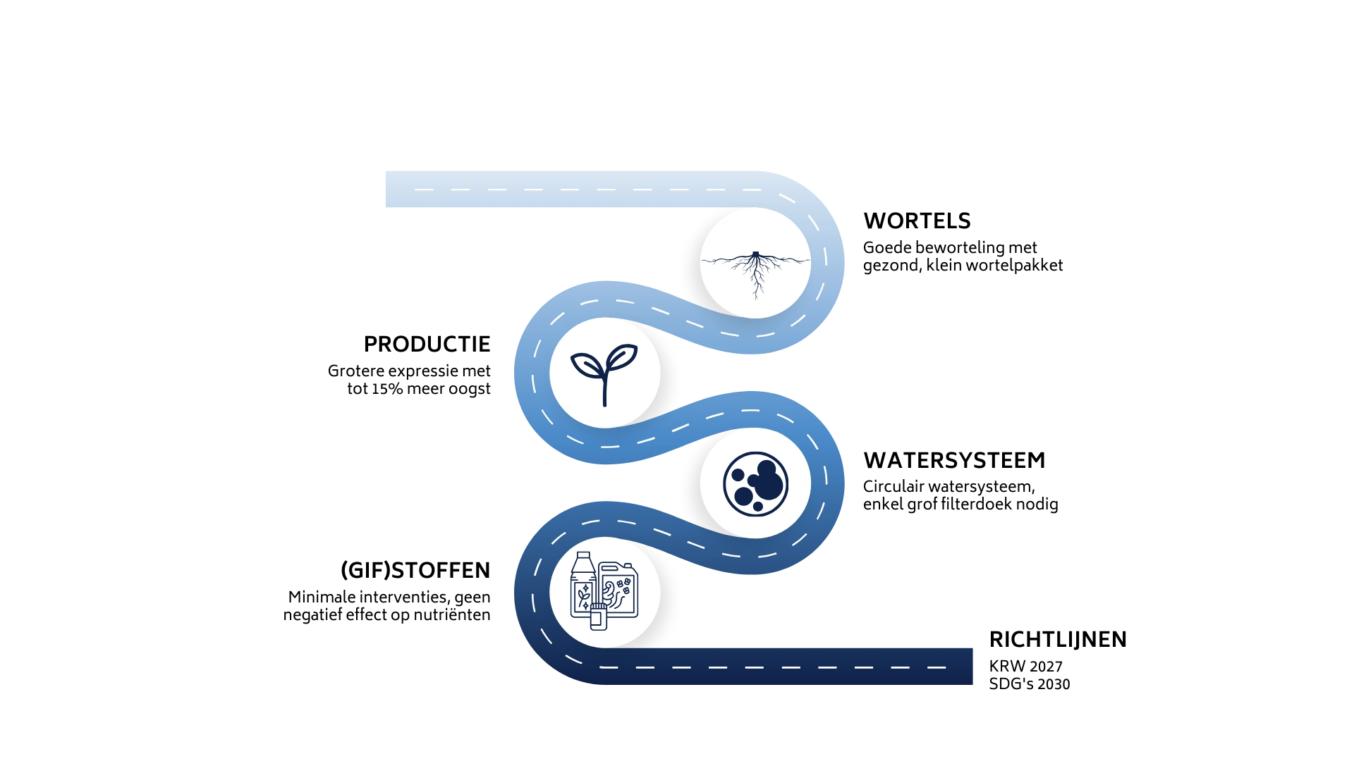 Onze technologie schoont het volledige watersysteem op waardoor de waterkwaliteit hoger wordt en voedingsstoffen beter opneembaar. Hierdoor zijn er minder chemicaliën nodig en kan de recirculatie verhoogd worden met minder lozingen.